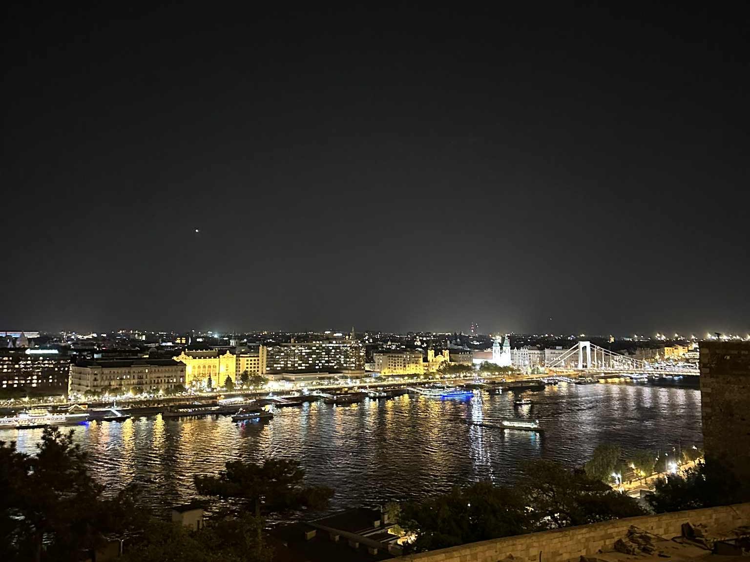 Kiedy w końcu dotarłyśmy na górę, przed nami rozciągał się jeden z najbardziej znanych widoków w całym Budapeszcie – miasto migoczące tysiącem świateł oraz Dunaj wyglądający jak ciemne lustro, w którym odbijały się wszystkie mosty. Stojąc tam, trudno było zdecydować, czy bardziej podziwiać same budynki, czy właśnie te charakterystyczne łuki mostów, które w nocnym świetle i z tej wysokości wyglądały jak wstążki zrobione z lamp.