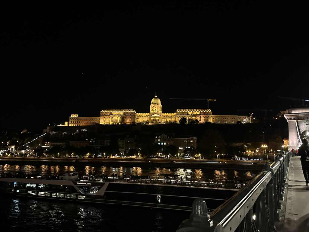 Na koniec nocnego spaceru trafiłyśmy na Wzgórze Zamkowe, gdzie znajduje się słynny Zamek Buda (Budai Vár). To miejsce, które od wieków jest obok Parlamentu symbolem miasta – pierwsze umocnienia powstały tu już w XIII wieku, a później kompleks był wielokrotnie przebudowywany, dlatego widać w nim mieszankę stylów: gotyk, renesans i barok.