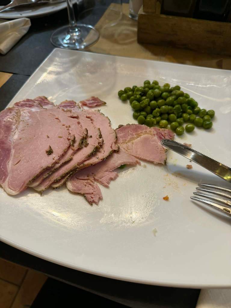 Wracając do trufli – podobno w lokalnych restauracjach można spróbować ich w najróżniejszych odsłonach, jako głównej gwiazdy talerza. Jednak nas taka degustacja ominęła, a wręcz doświadczyłyśmy ogromnego kulinarnego rozczarowania, gdyż przez dwa dni miejsce na kolacje wybierała organizacja goszcząca, z czym nie bardzo mogliśmy wszyscy polemizować. Niestety, tego rodzaju zorganizowane posiłki = ograniczone menu. Tak więc oto prezentowała się moja najgorsza kolacja ever, którą oczywiście musiałam udokumentować fotograficznie (Gosia miała trochę więcej szczęścia, gdyż wybrała opcję wegetariańską i dostała talerz serów5):