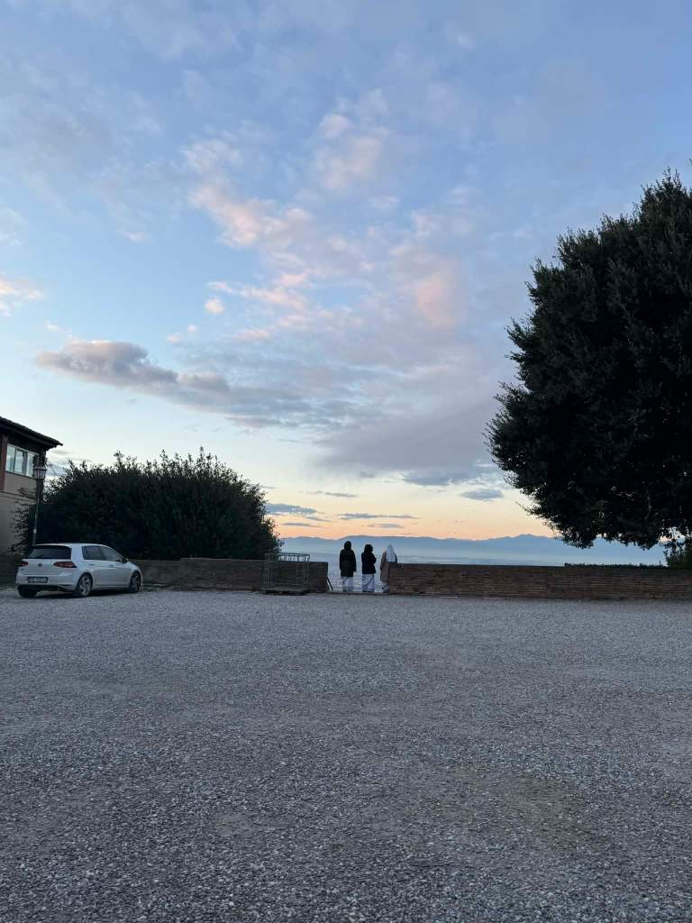 Najwyraźniej intuicja nas nie zawiodła, bo po kilku minutach zatrzymałyśmy się pod hotelem. Szybko okazało się, że mieści się on – przynajmniej według mojej pobieżnej oceny – w budynku dawnego klasztoru. Trudno o „lepsze” zwieńczenie dnia pełnego wrażeń. Przyjęto nas tam bardzo serdecznie, jednak sam pokój zdecydowanie nie trafił w mój gust. Gdybym miała wybór, nie zdecydowałabym się na nocleg w takim miejscu z własnej, nieprzymuszonej woli. Wszystko sprawiało wrażenie, jakby pokoje były kiedyś celami mnichów. Drewniane belki pod sufitem, wyposażenie w mocno antycznym stylu (np. stojak na walizkę2) i unoszący się w powietrzu lekko stęchły zapach tylko potęgowały to wrażenie. Na szczęście rekompensował to piękny widok z okna, choć naprzeciwko znajdował się budynek, którym znajdował się chyba… szpital3, co dodawało całości specyficznego klimatu. Pierwsza noc naszego pobytu wydawała się nieco dziwna i momentami wręcz filmowo „creepy”, ale być może to kwestia mroku i zmęczenia. Rano wszystko wyglądało już zupełnie inaczej – podczas śniadania z dużego okna jadalni rozpościerała się jeszcze piękniejsza panorama Toskanii, niż z naszego pokoju. Gdzieś daleko pośród krajobrazu można było nawet śledzić wzrokiem przejeżdżające pociągi ichniejszego PKP, czyli TrenItalia.